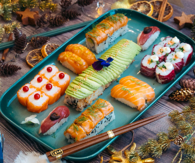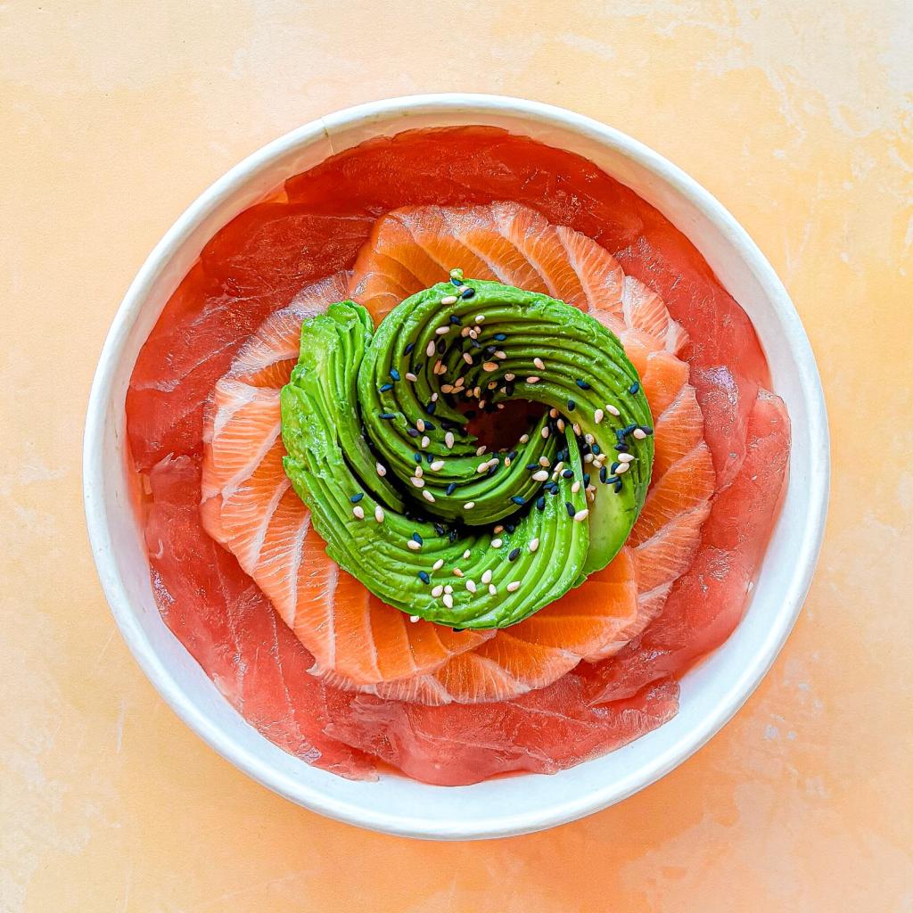 Riz vinaigré, fines lamelles de saumon et de thon, avocat en tranche