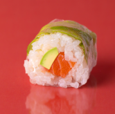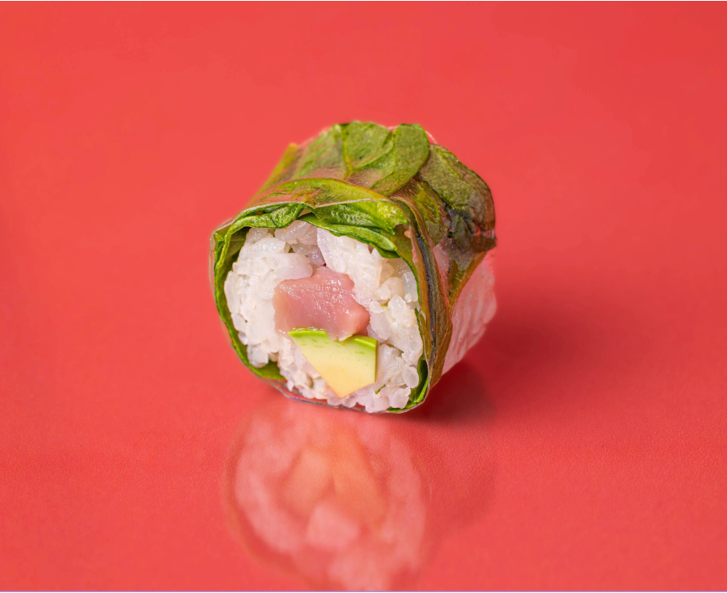 Avocat crémeux, thon rouge, riz vinaigré, salade laitue, le tout enveloppé dans une feuille de riz.