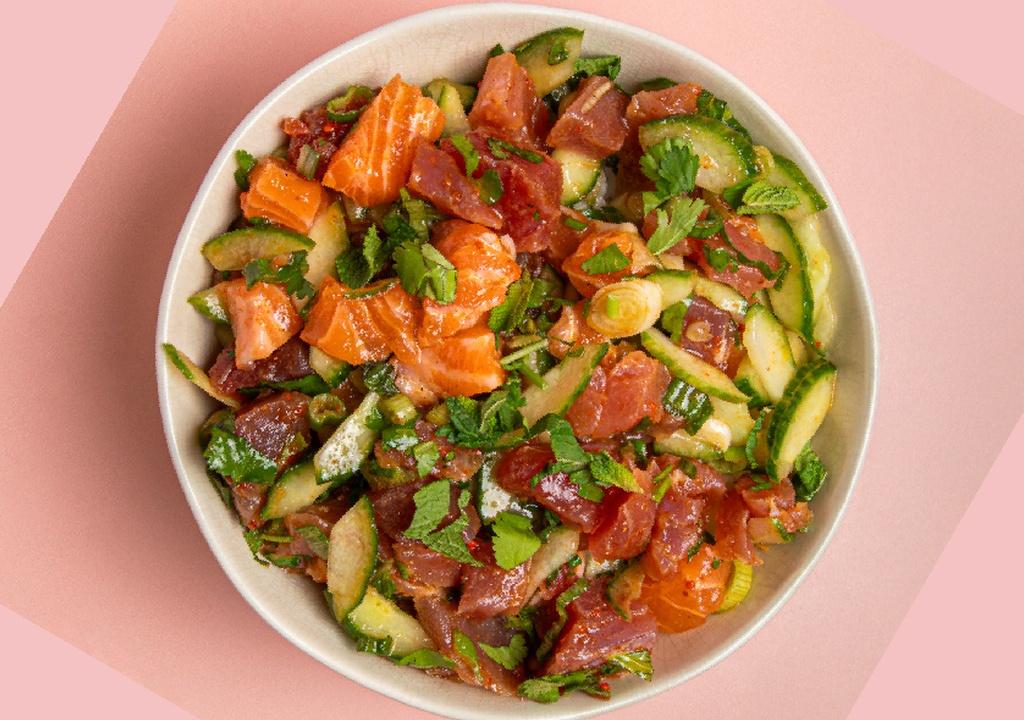 Riz vinaigré, dés de saumon et de thon marinés, concombre, menthe-coriandre, oignons cébettes, huile d’olive, sel japonais, citron vert, épices furikake.