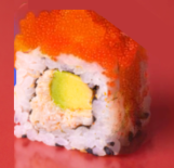 Chair de crabe, avocat crémeux, mayonnaise, sauce ponzu et riz vinaigré, enroulé dans une feuille de nori et du masago.