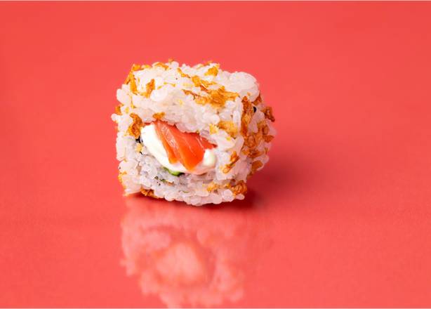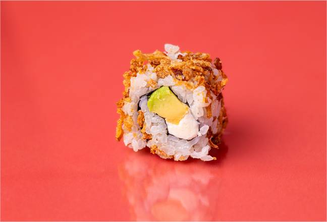 Avocat crémeux, fromage frais, riz vinaigré et oignons frits croustillants, le tout enveloppé dans une feuille de nori.