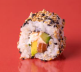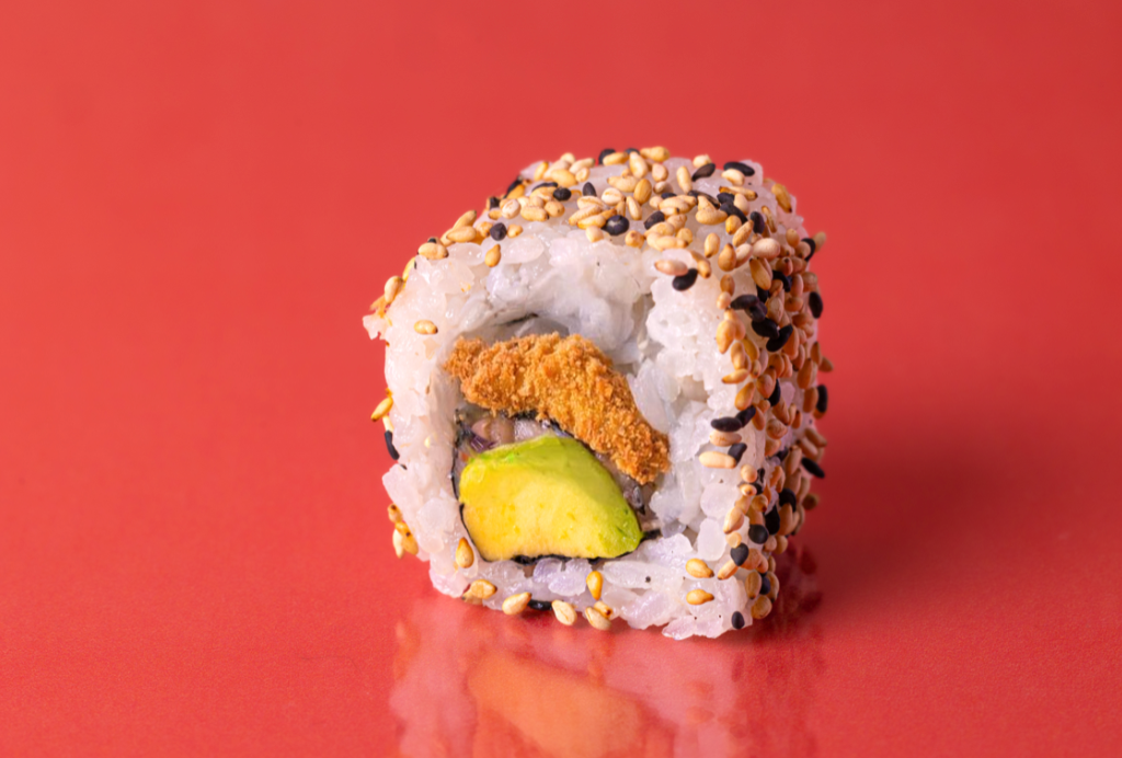 Crevette Tempura, Avocat, Mayonnaise Spicy et Graines de Sésame. Allergènes : Crustacés, Gluten, Oeuf, Moutarde, Sésame.