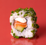 Saumon, avocat crémeux, fromage frais, et riz vinaigré, enroulé dans une feuille de nori et de la ciboulette.