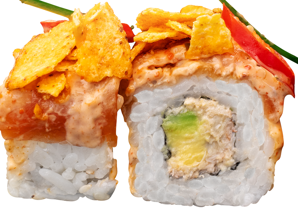 Dessus : saumon snacké, piment rouge, ciboulette, doritos. Dedans : algue de nori, crabe, avocat, mayonnaise ponzu.