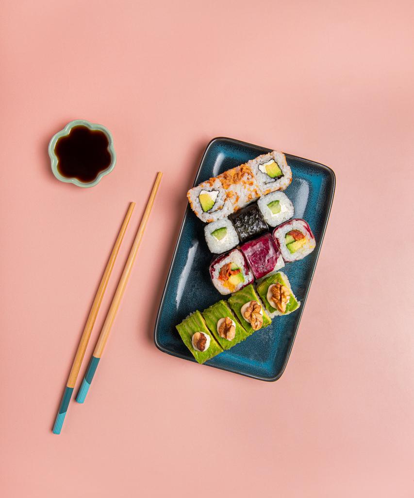 Dessus : avocat en lamelles, noix concassées, crème de wasabi. Dedans : algues de nori, fromage frais, concombre, tomates séchées.
